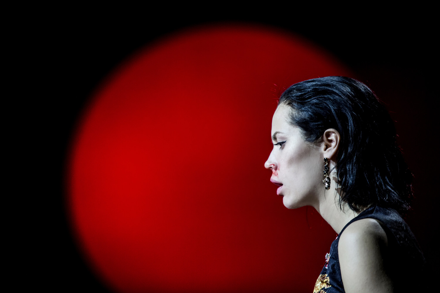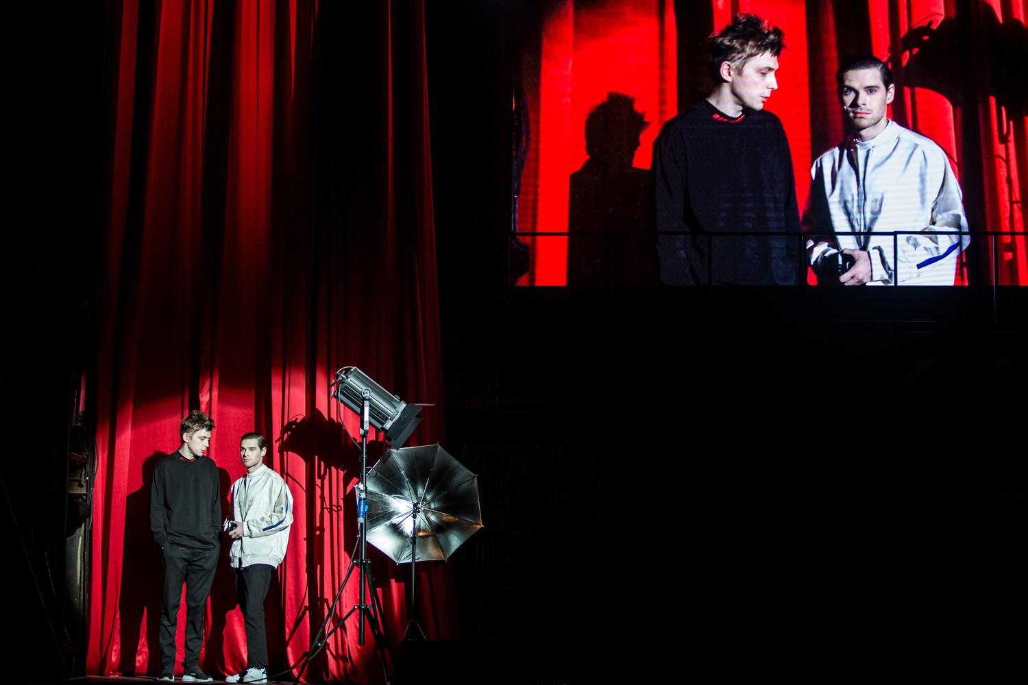 Для спектакля в «Гоголь-центре» сцену – впервые в истории этого театра! – оснастили красным занавесом. Что не должно вводить в заблуждение: время действия – современность, герои читали и Мольера, и его последователей, оттого не стесняются прямо сравнивать Альцеста с Чацким (они, правда, двойняшки; и «Мизантроп» волей-неволей перекликается с оперой «Чаадский», которую Кирилл Серебренников поставил в «Геликоне»). Явление первое, в котором Альцест встречается с приятелем Филинтом, происходит в телестудии: Филинт ведет ток-шоу, где Альцест – гость. В отличие от недавнего «Мизантропа» в «Комеди Франсез», деликатно перенесшего текст XVII века в современность,