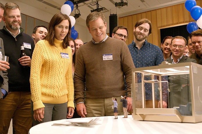 Сатира быстро если не сменяется, то дополняется щемящей человеческой нотой: простой американский парень Пол Сафранек (все всё время норовят неправильно поставить ударение в фамилии; его-то совершенно грандиозно и играет Мэтт Дэймон) возится с больной матерью. Она, насмотревшись теленовостей про чудо-изобретение, недоумевает: зачем всё это, если никто так и не изобрёл средства против её мучительного недуга. «У каждого своя боль», – неуклюже утешает сын. Пройдёт еще несколько лет, и Пол сам решится на уменьшение – которое, дав всё, что обещала реклама, так и не приведет к счастью, напротив, разрушит такие, казалось, прочные отношения (в роли жены Пола – Кристен Уиг, ещё одна абсолютная актерская удача богатого интереснейшими персонажами фильма). Но и развязка этой личной истории далеко не конец фильма; про разбитое сердце Пейну словно бы надоедает, он подселяет к Полу брутального соседа Душана с подельником Конрадом (невероятный дуэт Кристофа Вальца и Удо Кира), сводит с искалеченной при нелегальной эмиграции вьетнамской диссиденткой и устремляет фильм к контрабандным приключениям и философским обобщениям.