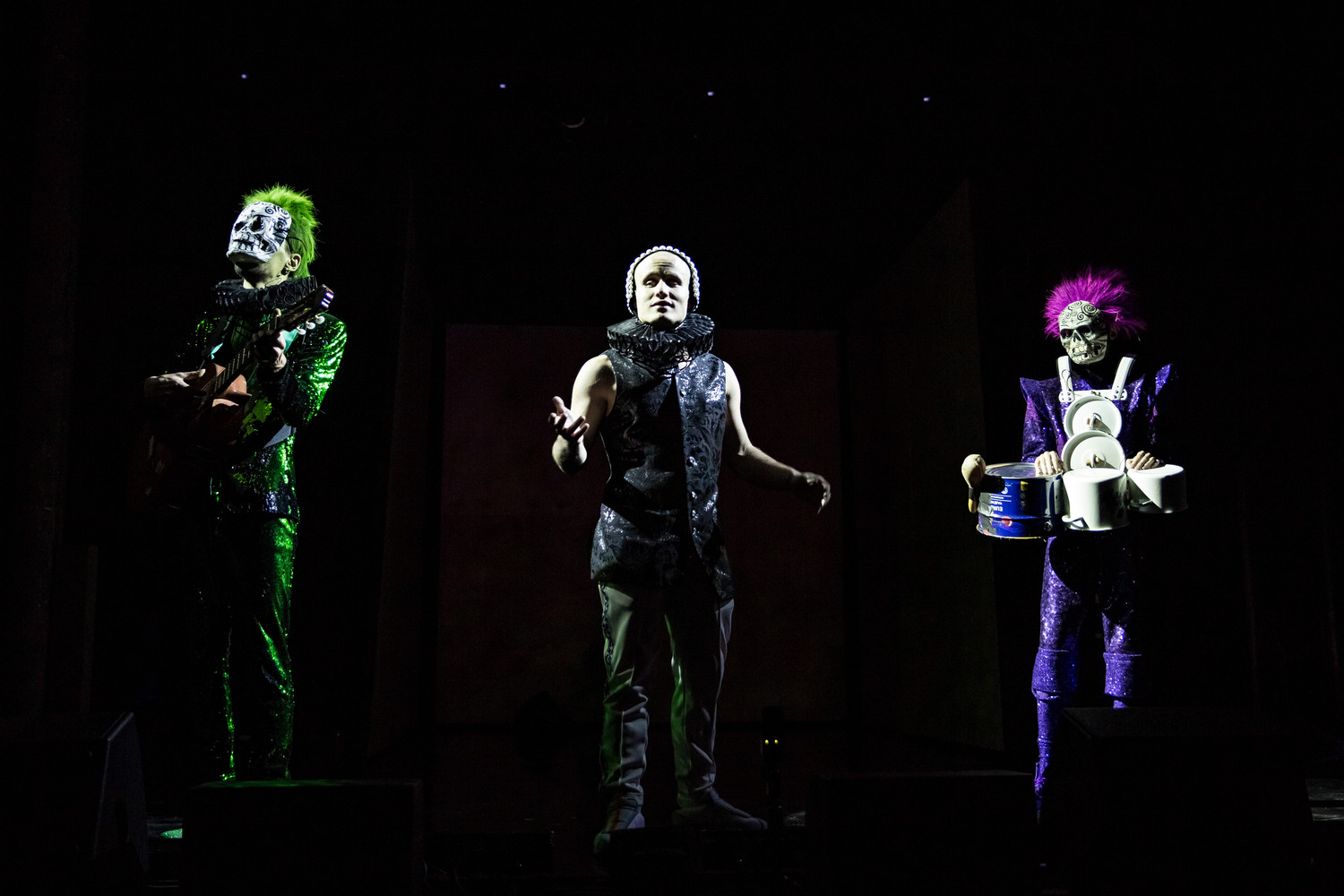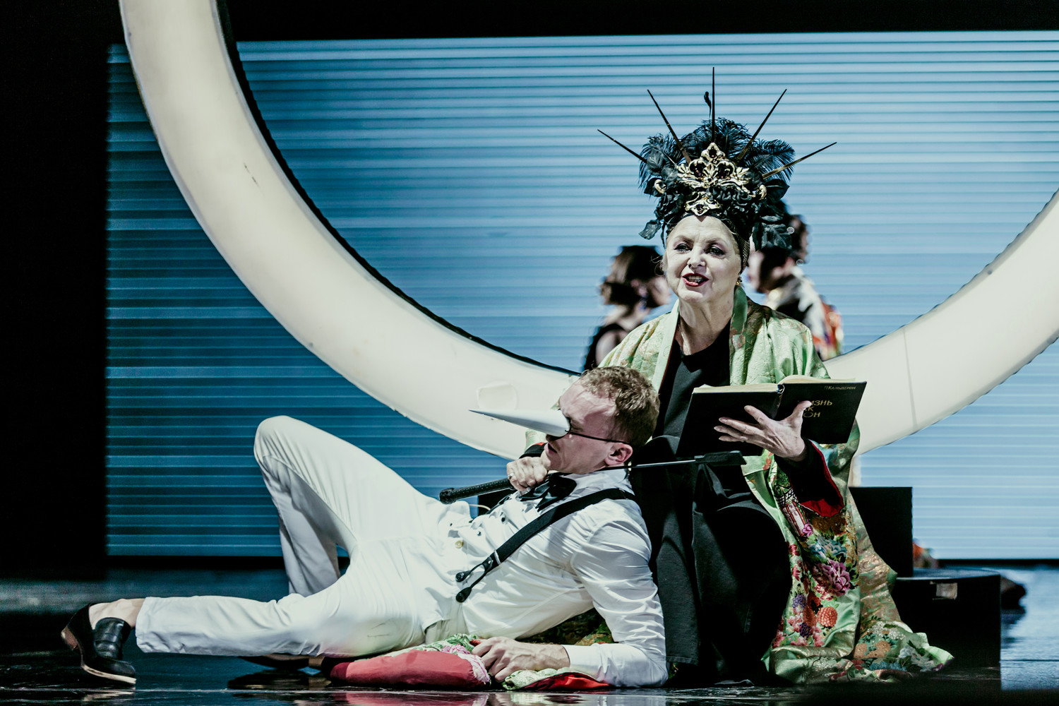 Вот на сцену выходят Три Счастливые Старухи (бронебойное актерское трио Гоголь-прим – Светлана Брагарник, Ирина Выборнова и Ольга Науменко), они славят Правителя: «Слава Солнцу-Отцу! Как счастлив этот день – День рождения нашего Правителя!». Дива Неземная (один из персонажей Надежды Павловой, артистки Пермского театра оперы и балета) поёт Генри Пёрселла – как гимн Правителю, который здесь – не подтянутый кремлевский манекен (как было когда-то у Кирилла в финале мхатовского «Леса»), а украшенный драгоценностями скелет-марионетка. Он способен изрекать то, что всегда изрекают здешние правители: «Счастье! Радость! Вера! Стабильность!»