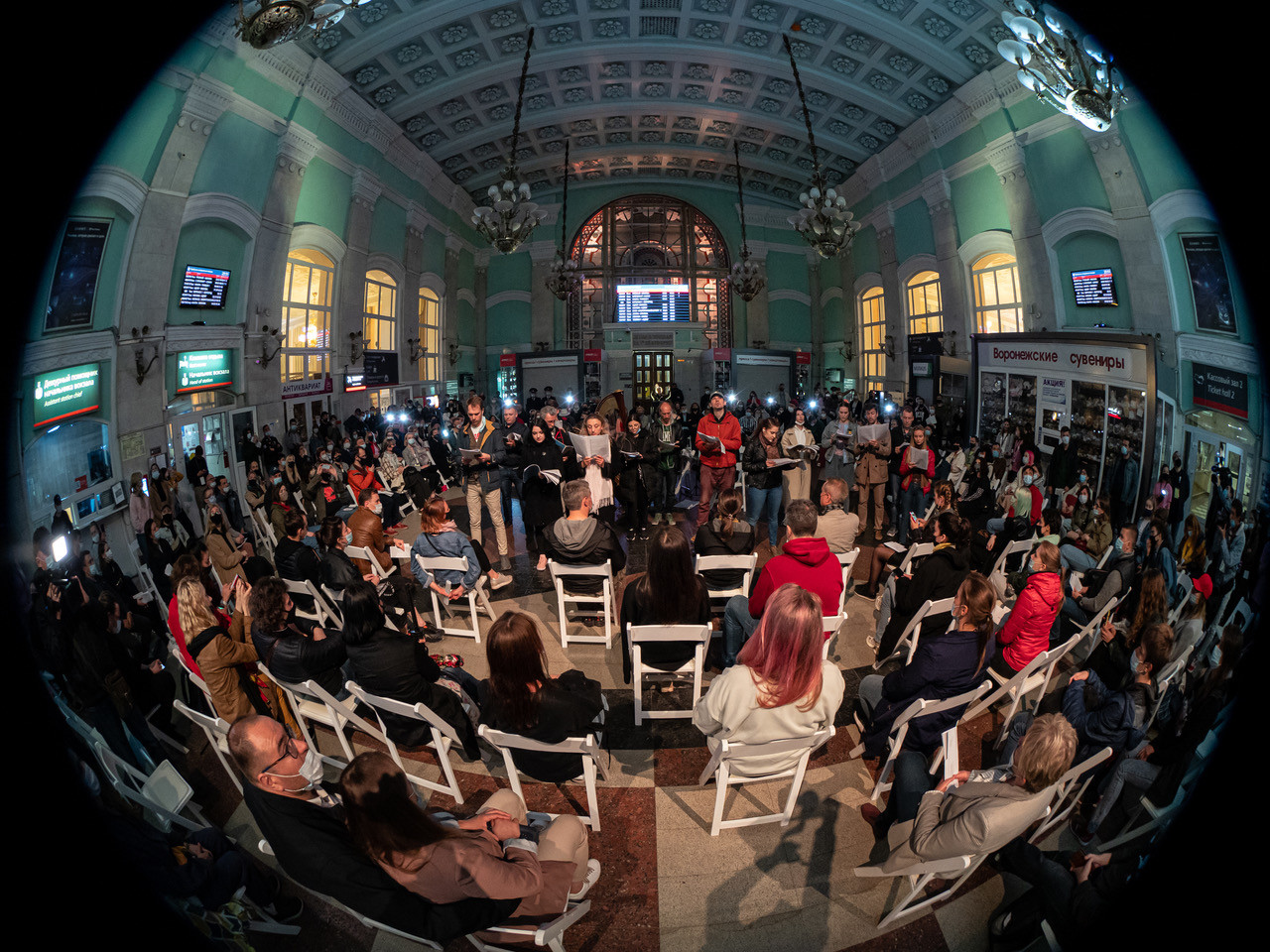 Ладно, главное, что в кульминационной части проекта – собственно, опере, исполненной в главном здании вокзала коллективом Посаженникова «Геометрия звука», хором Воронежского театра оперы и балета, дуэтом из фольклорного ансамбля «Воля» и хоровой капеллой им. В. Ижогина в главном здании вокзала – снова восторг, уже не смазанный вторжением повседневности;