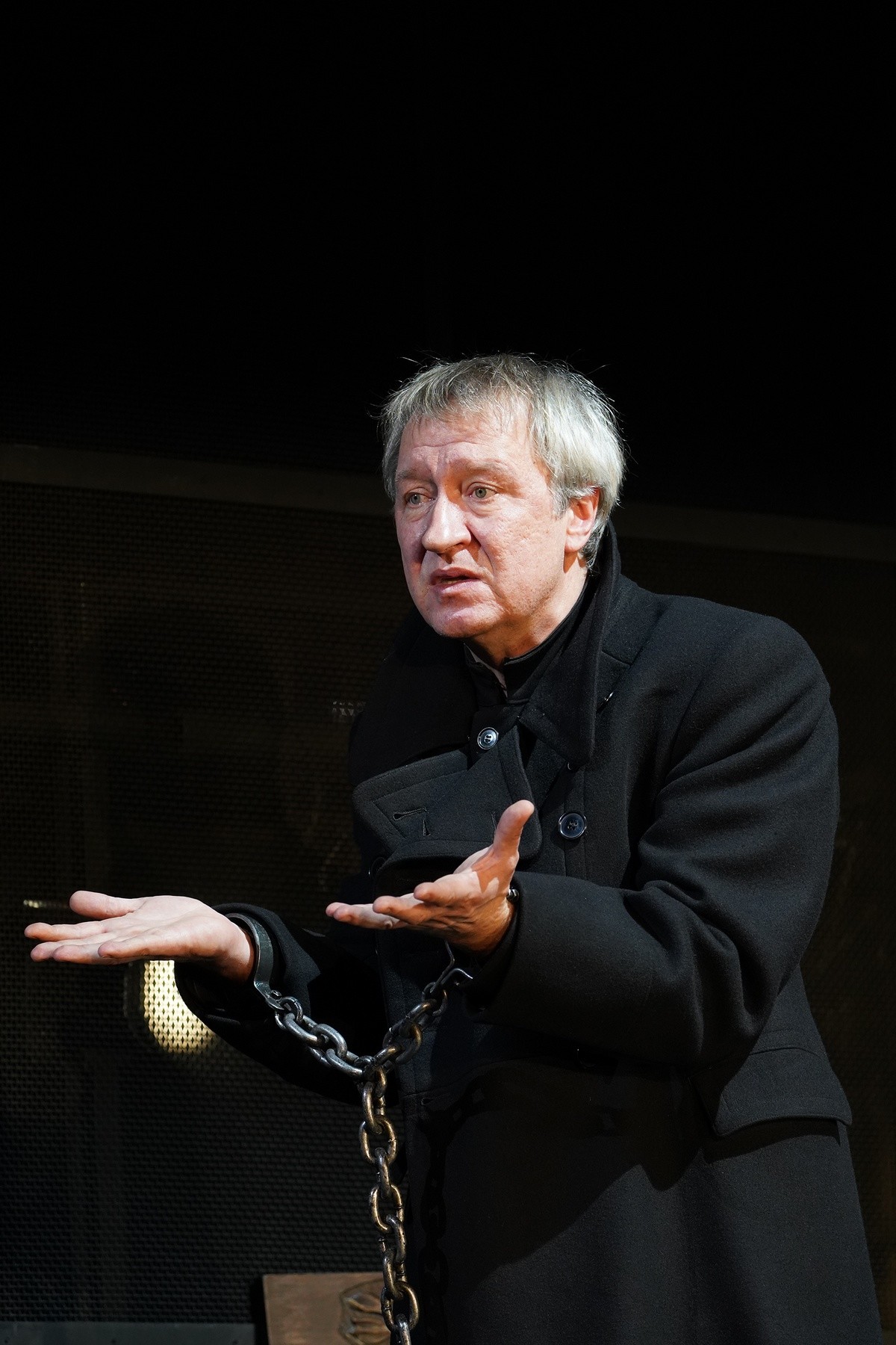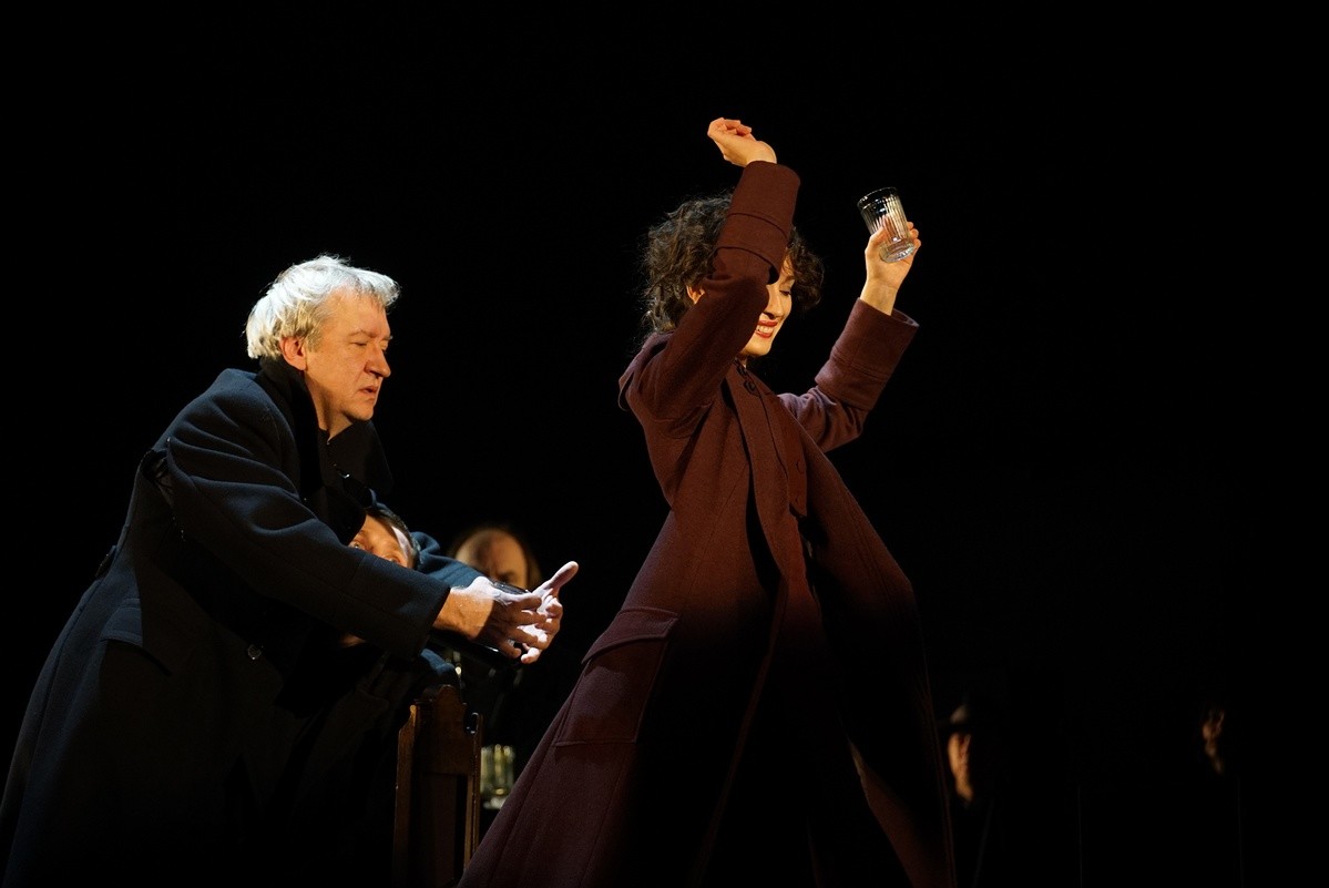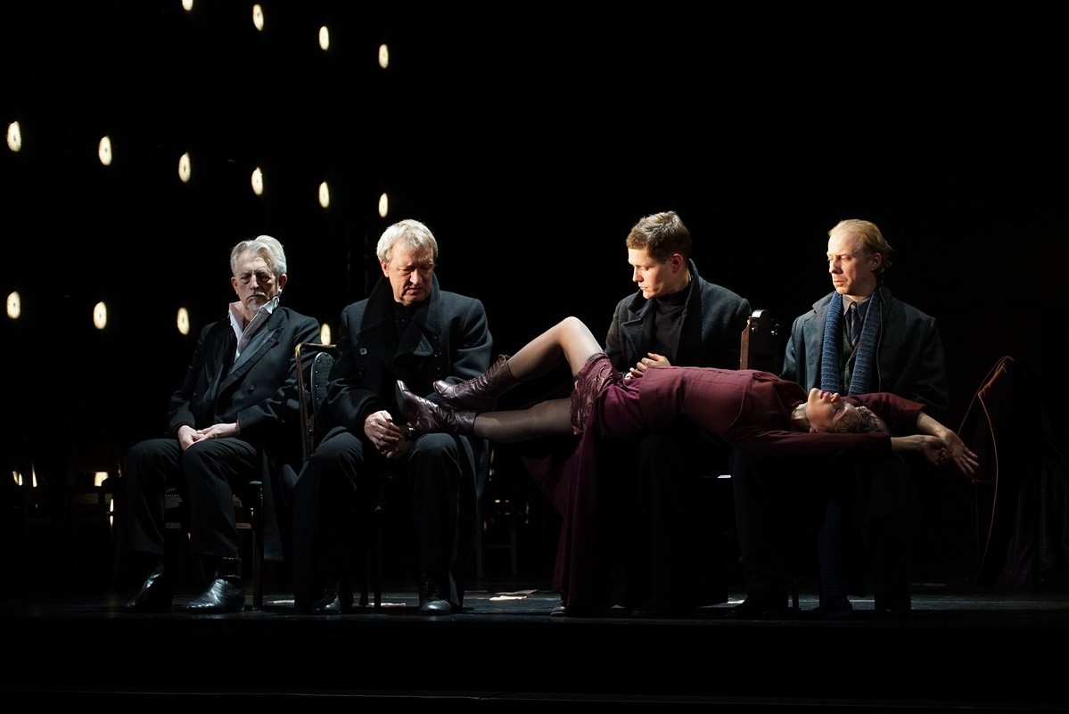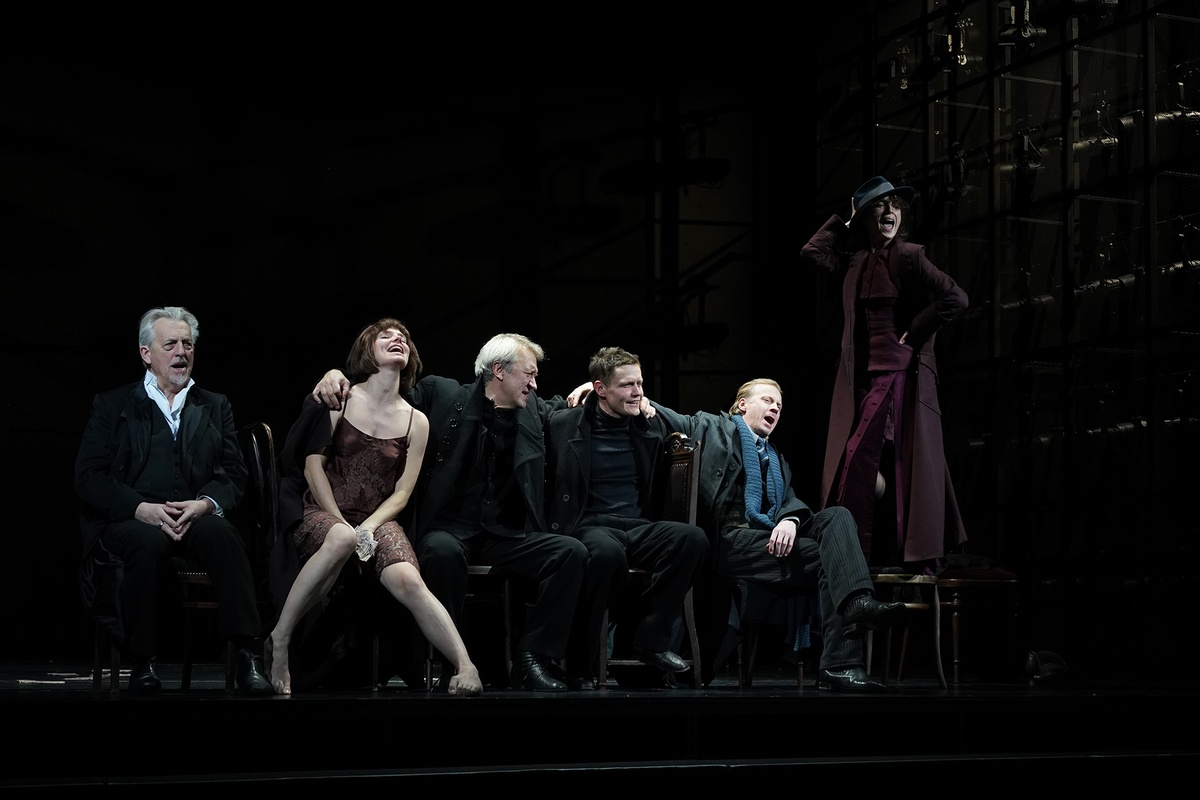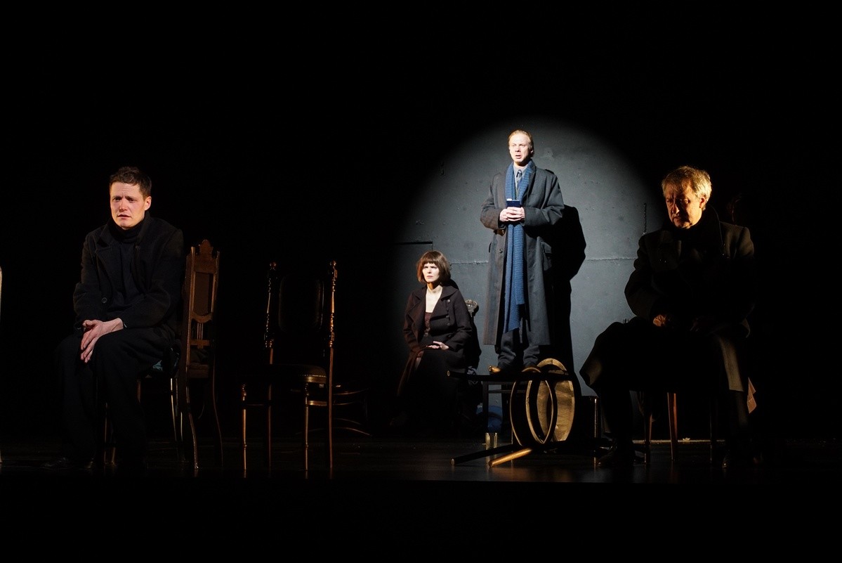 Додин избавляется от всего «лишнего», оставляя на планшете сценической комнаты дознаний только ключевых протагонистов большого романа. И отдавая приоритет слову: спектакль, работа над которым началась четыре года назад, строится на пьесе, где в реплики оставшегося минимума действующих лиц вкрадываются фрагменты слов устранённых персонажей.