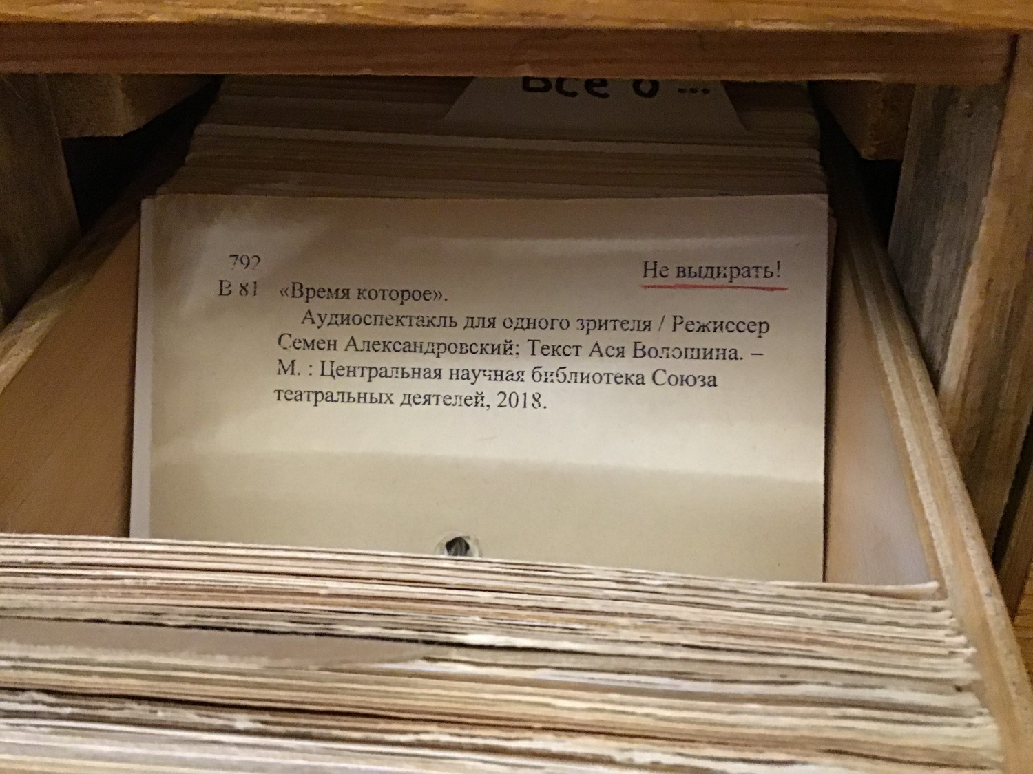 Пьеса Аси Волошиной играется в формате «радиотеатра»; спектакль легко посмотреть, потому что его сеансы доступны в рабочие часы Центральной научной библиотеки СТД. Прихóдите в читальный зал, прохóдите через маленькое приключение – ритуал получения книги из хранилища, берёте на руки папку, внутри которой плеер с наушниками, садитесь за любой стол и один час шестнадцать минут слушаете пьесу, которую играют молодёжь и корифеи – Николай Мартон и Наталья Тенякова (её участие и сюжет, замешанный на истории и семейных тайнах, роднит «Время» с новым фильмом Андрея Смирнова «Француз»).
