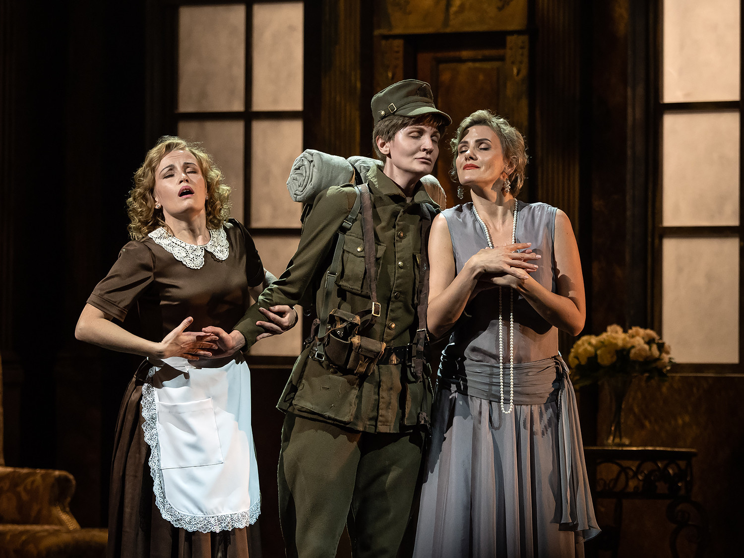 «Свадьба Фигаро» – эталонный спектакль, способный примирить коней и трепетных ланей, то бишь, и тех, кто ждёт от оперы в первую очередь авторского театра, и тех, кому важно, чтобы Моцарта играли в живописных декорациях, а не в телефонной будке, и Моцарт звучал. Здесь всё «по тексту» (с минимальными купюрами), будуар графини Розины (художник – Алексей Вотяков) отсылает к эпохе классицизма, когда опера и создавалась, но пролог переносит действие в более близкие нам времена: увертюру сопровождает хроника Первой мировой (видеохудожник – Алексей Бычков).