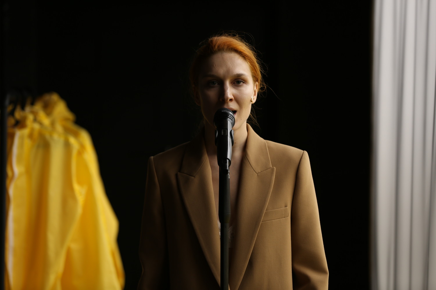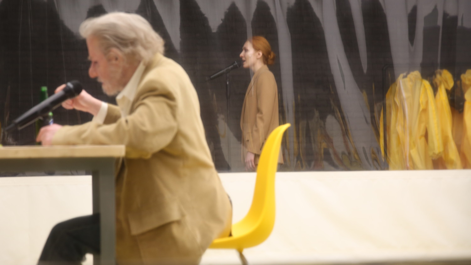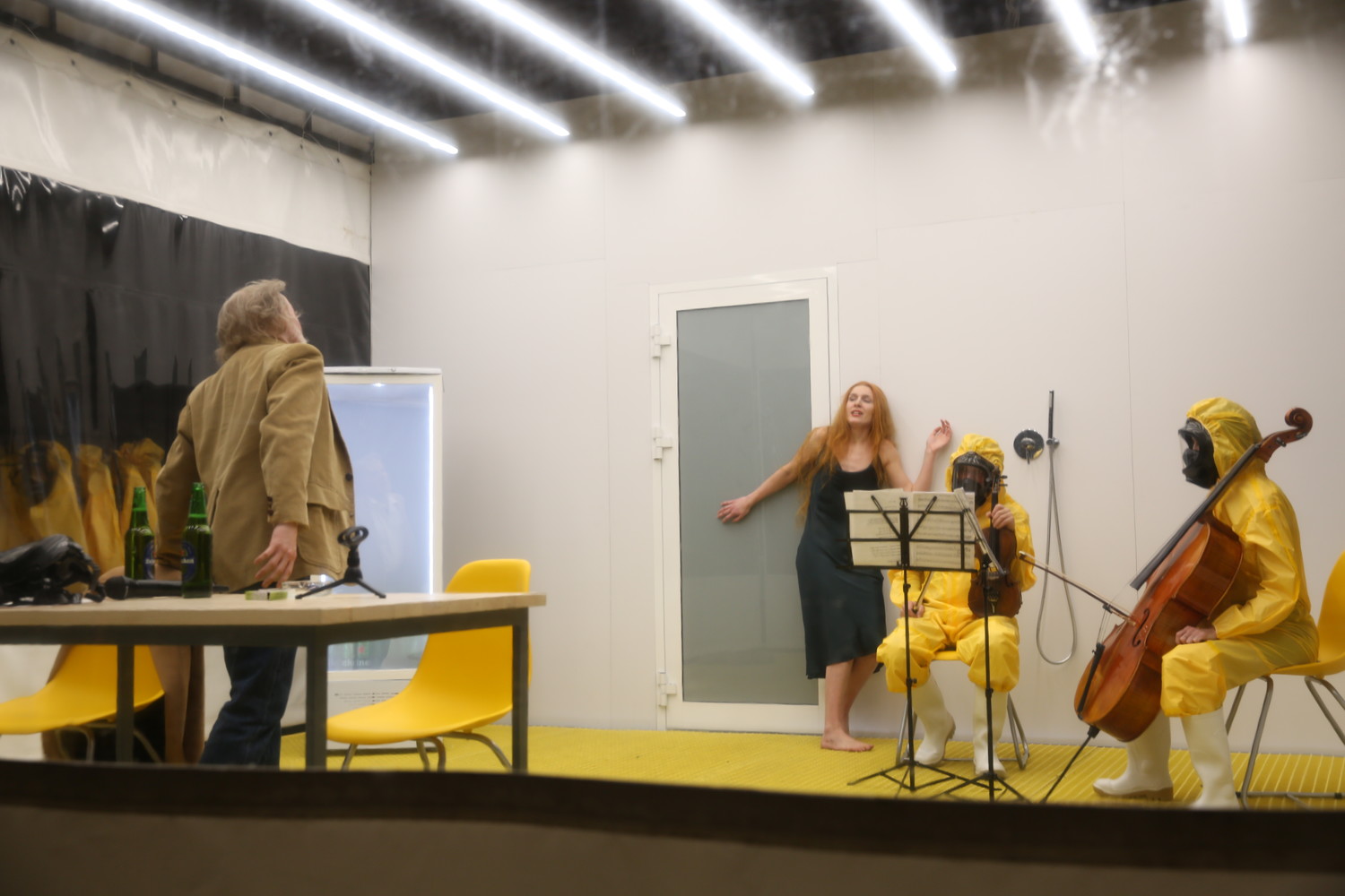 Игровое пространство от зрительного зала отгорожено прозрачной пластиковой завесой; внутри – белая студия, стол с микрофоном, холодильник, набитый баночным пивом, ничего, в общем, необычного, но пространство антиутопии, мира, изменённого невидимым вирусом, опознаётся с полувзгляда; даже до появления струнного дуэта в защитной жёлтой спецодежде. У спектакля есть хэштэг #virusBukowski – на сцене с самого начала присутствует основной носитель этого вируса, американский поэт и писатель Чарльз Буковски: его маска (вкупе с пластикой) полностью преображает актёра Михаила Гостева, идентифицировать которого без программки было бы невозможно.