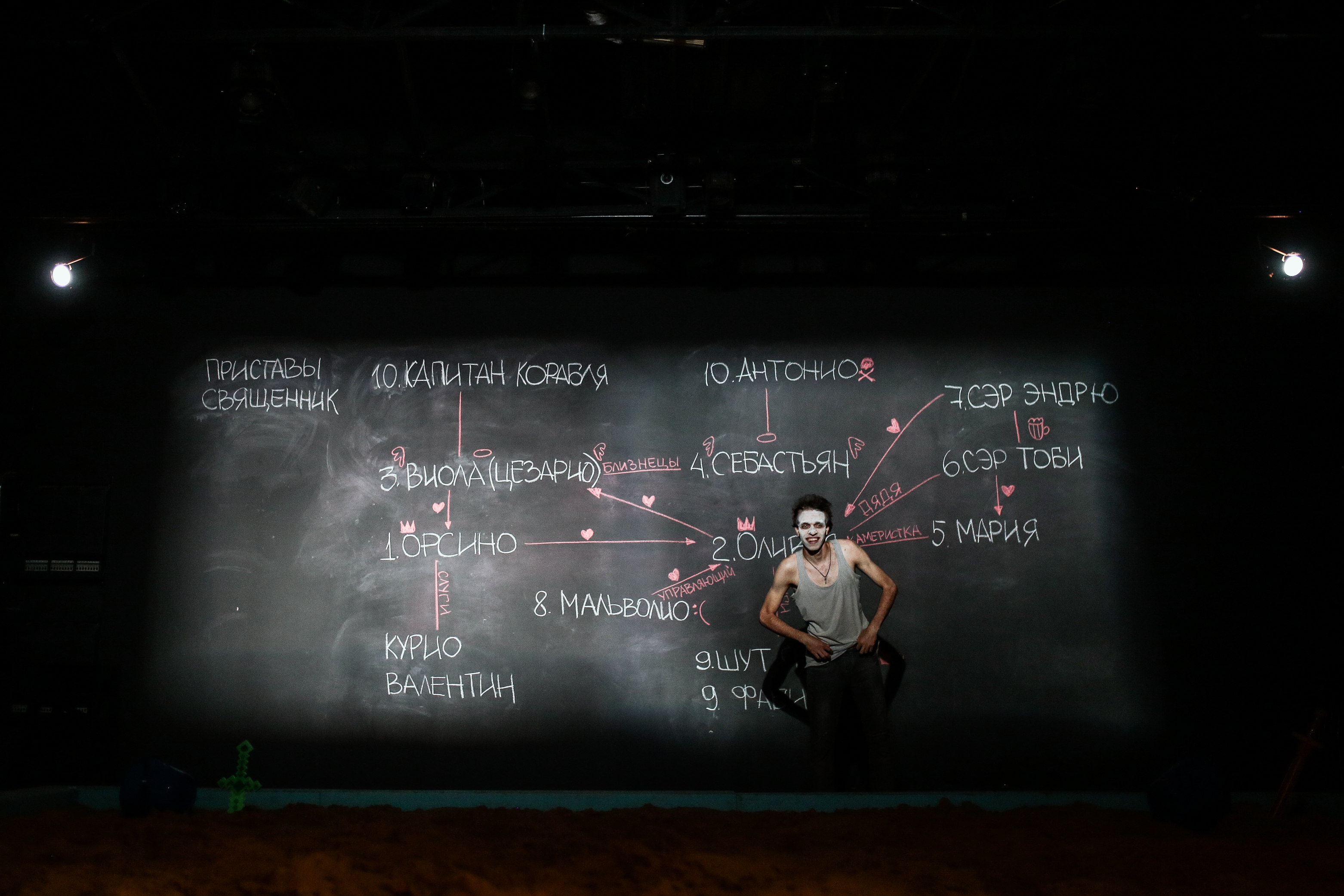 Но вернёмся в зал, где для занявших свои места зрителей рисуют карту персонажей – разобраться в сюжете и действующих лицах не так-то просто, даже если ты видел с дюжину «Двенадцатых ночей». Так что не зря Борис Алексеев, худрук Никитинского, представляет шекспировских влюблённых и клоунов. Все имена написаны как на школьной доске; героев связывают стрелки; рукописные «эмодзи» помогают быстро вспомнить, кто с кем в каких отношениях состоит: