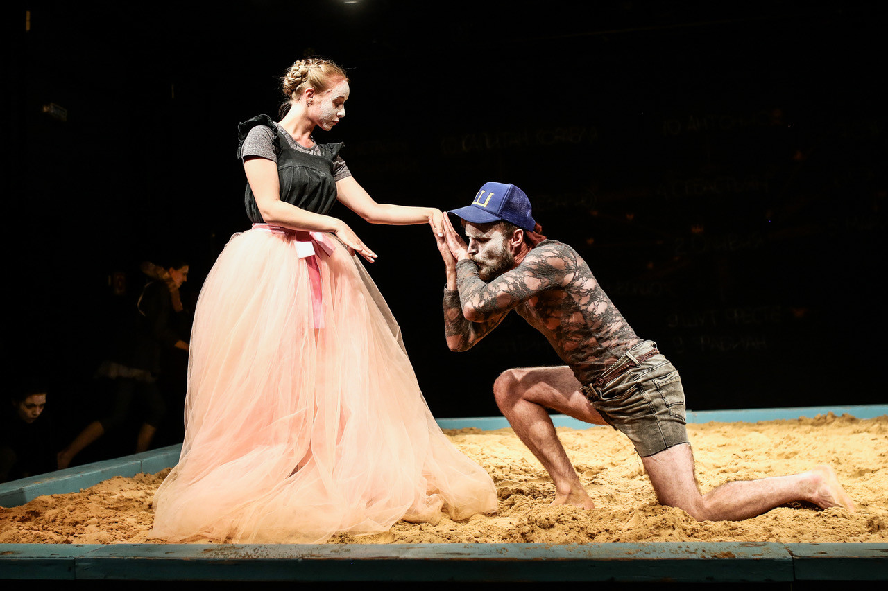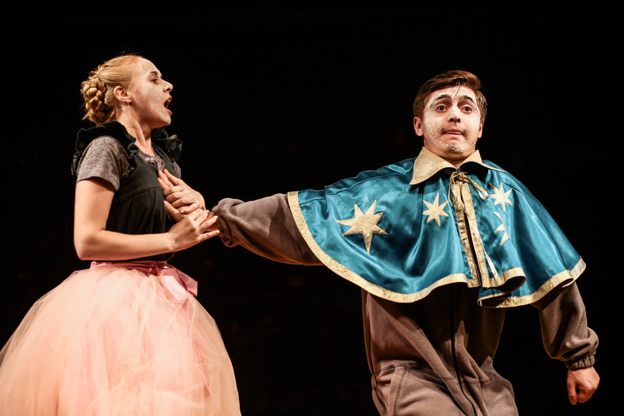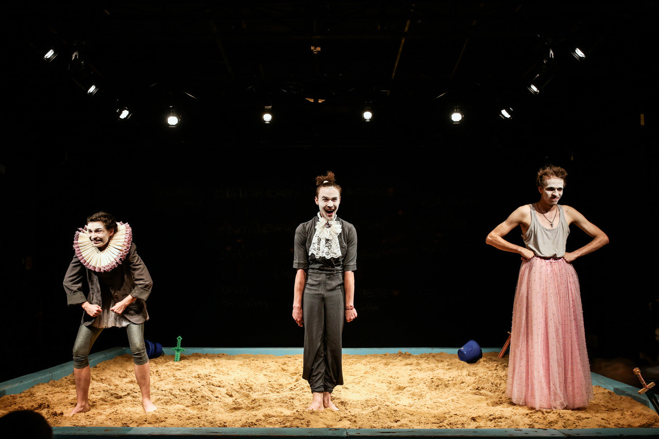 Всё начинается уже в маленьком фойе – актёры гримируются и переодеваются, смешавшись со зрителями. Нехитрый, скажете, приём, но бесшабашное настроение карнавала задаёт мгновенно; стирает дистанцию «важности» и вовлекает в действие, которое будет пениться, как морской прибой у берега мифической Иллирии, куда Шекспир забросил своих потерпевших кораблекрушение близнецов, Виолу и Себастьяна. Муравицкий, говоря о спектакле, часто пользуется словосочетанием «уличный театр», и ещё до премьеры прогоны «Двенадцатой ночи» устраивали под открытым небом, на территории арт-кластера «Винзавод». Сымитировать площадное зрелище в камерном театральном пространстве невозможно, «уличность» здесь – эвфемизм почти цирковой несерьёзности. Эта «Двенадцатая ночь» намеренно лишена всякого интеллектуального груза и решена как бравурная комедия масок – под «детскую» музыку, исполняемую на игрушечных инструментах.
