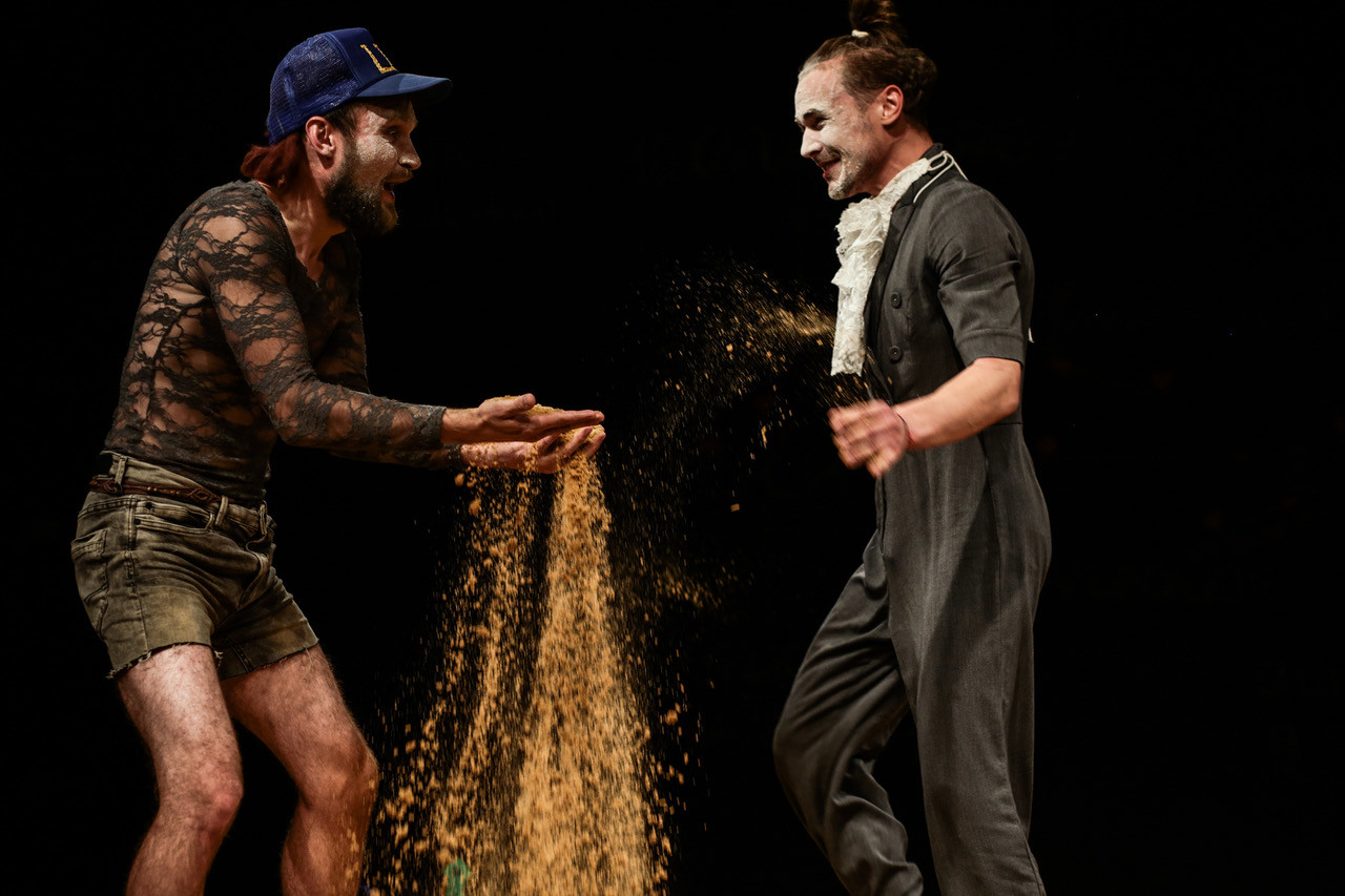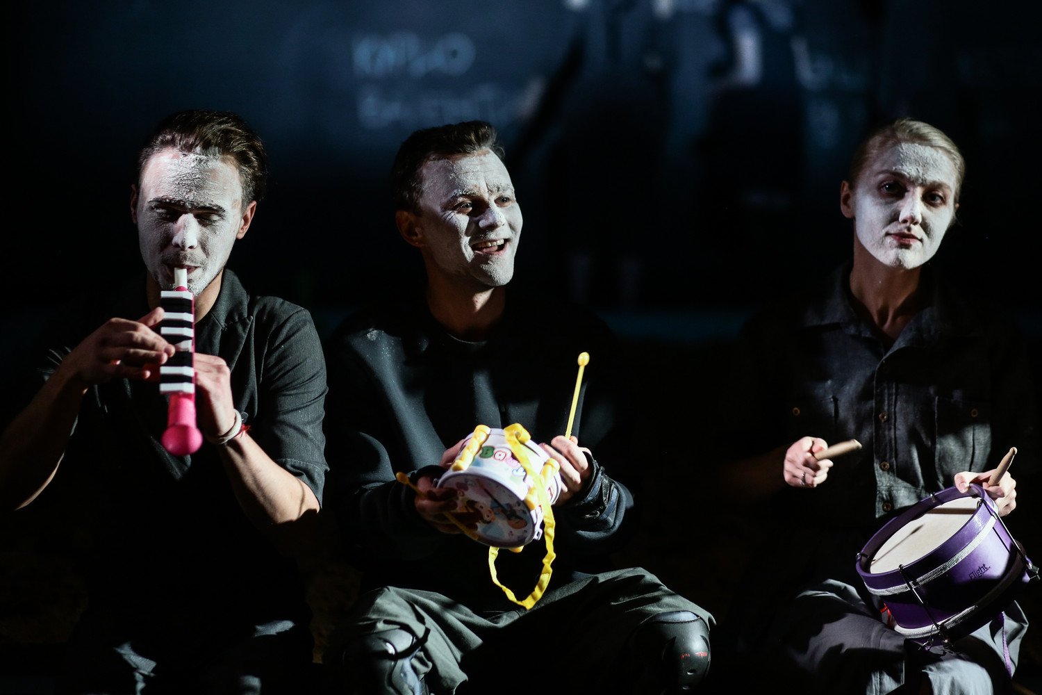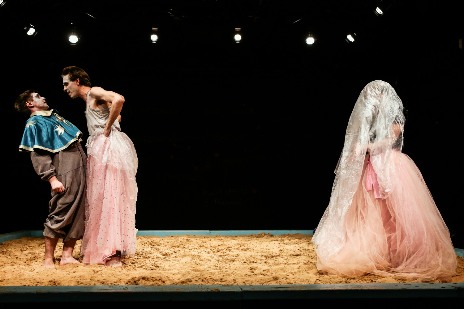 Всё начинается уже в маленьком фойе – актёры гримируются и переодеваются, смешавшись со зрителями. Нехитрый, скажете, приём, но бесшабашное настроение карнавала задаёт мгновенно; стирает дистанцию «важности» и вовлекает в действие, которое будет пениться, как морской прибой у берега мифической Иллирии, куда Шекспир забросил своих потерпевших кораблекрушение близнецов, Виолу и Себастьяна. Муравицкий, говоря о спектакле, часто пользуется словосочетанием «уличный театр», и ещё до премьеры прогоны «Двенадцатой ночи» устраивали под открытым небом, на территории арт-кластера «Винзавод». Сымитировать площадное зрелище в камерном театральном пространстве невозможно, «уличность» здесь – эвфемизм почти цирковой несерьёзности. Эта «Двенадцатая ночь» намеренно лишена всякого интеллектуального груза и решена как бравурная комедия масок – под «детскую» музыку, исполняемую на игрушечных инструментах.