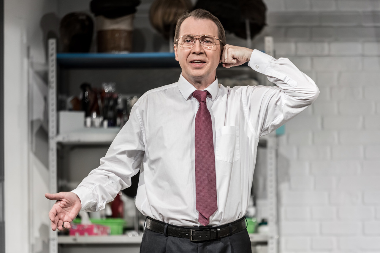 Начинается спектакль «с конца»: сентябрь 1999-го, Михаил Сергеевич у постели Раисы Максимовны, умирающей от лейкоза в мюнстерской онкологической клинике. Хроника прощания даётся сухо – читкой с листа, без надрыва, без сентиментальности, которой будет вдоволь, но чуть позже, когда пойдёт разговор не о смерти, о жизни. Дальше – свет, заливающий построенную на узкой полоске сцены, впритык к первому ряду, актёрскую гримёрку (и сценографию, и основанный на документальном материале сценарий сочинил сам Херманис). Весь реквизит – парики, маски, костюмы будто со страниц старых журналов – на глазах; по периметру зеркал – фотографии героев. Табличка с надписью «Тихо! Идёт спектакль», кажется, ещё не горит;