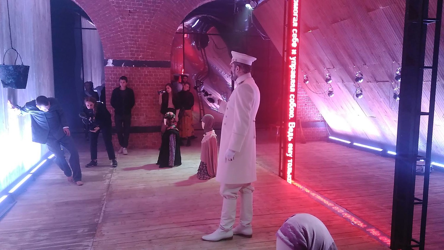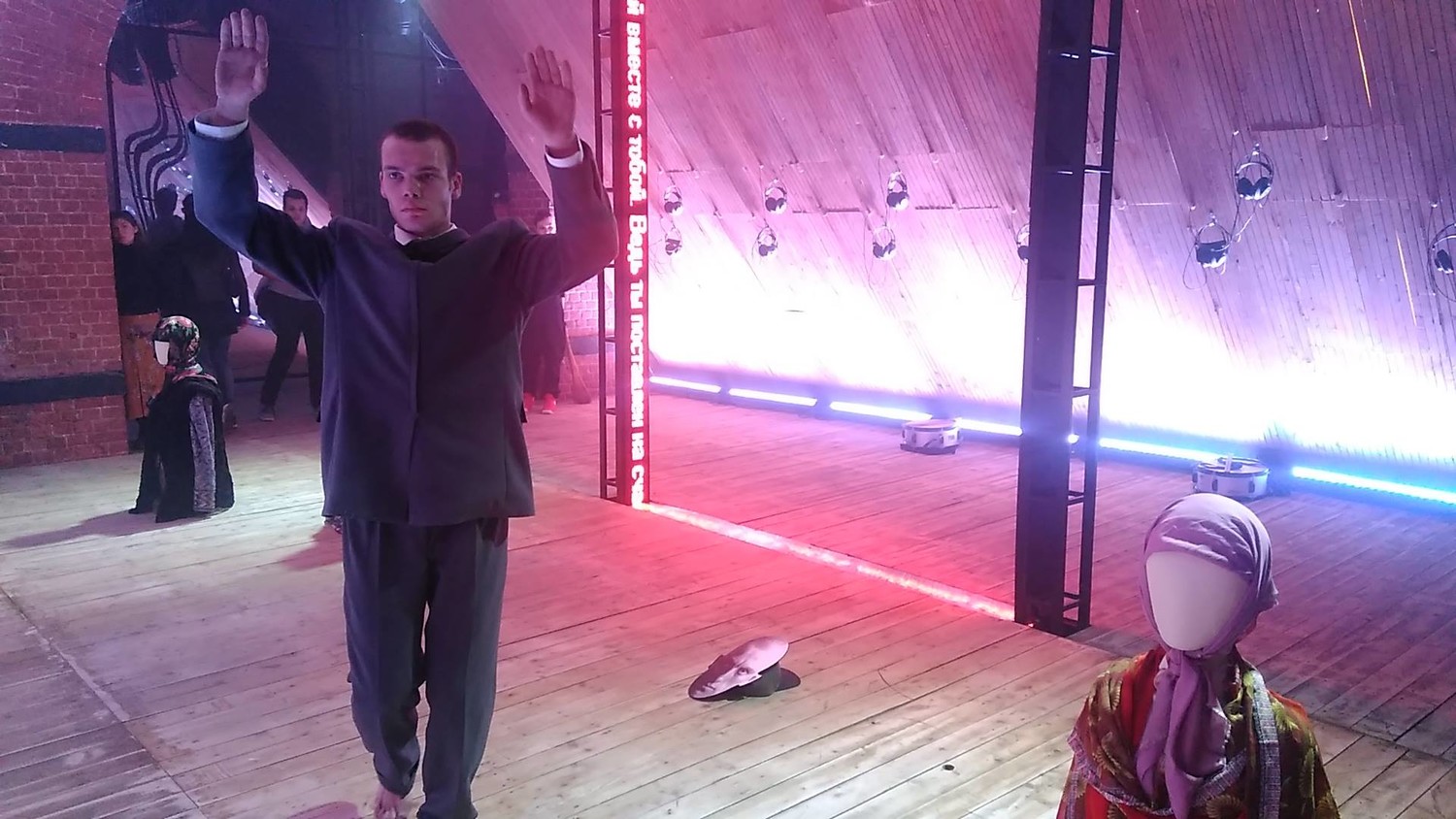 Сначала гротескные экскурсоводы – те самые бабуси в латаных чулках и кофтах (их играют брусникинцы обоих полов, отчего персонажи становятся совсем уж по-цирковому фантасмагоричными) – под аккомпанемент народных просьб к царю-батюшке группами провожают зрителей в залы; эта часть спектакля для всех более-менее одинакова. Дальше вы оказываетесь предоставлены сами себе, вплоть до общего для всех финала бродите, где хотите, так что дальнейшее – те фрагменты сна о революции, что удалось увидеть мне.
