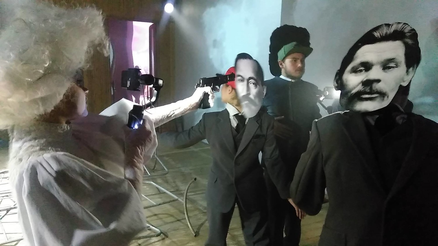 Под событиями, инспирированными Октябрём, я имею в виду не только Гражданскую войну (её начало становится томительным и прекрасным финалом «Х дней...»), но и легендарный спектакль Юрия Любимова в театре на Таганке: «Десять дней, которые потрясли мир», «народное представление с пантомимой, цирком, буффонадой и стрельбой по мотивам книги Джона Рида». Новая работа брусникинцев – посвящение Любимову, копродукция Мастерской и Фонда Любимова, и играют её в пространстве выставки «Любимов и время»: декорацией служат инсталляции, созданные по мотивам сценографии любимовских постановок, от барабанов «Доброго человека из Сезуана» до занавеса из «Гамлета». Пантомима, цирк и стрельба в наличии, как и любимовское стремление к тотальному театру: «Десять дней...» начинались даже не с вешалки, а у входа Таганки, где красноармейцы накалывали билеты на штыки, песни и пляски революционных солдат и матросов выплескивались на улицу и в фойе, театр и революция захватывали всё и вся.