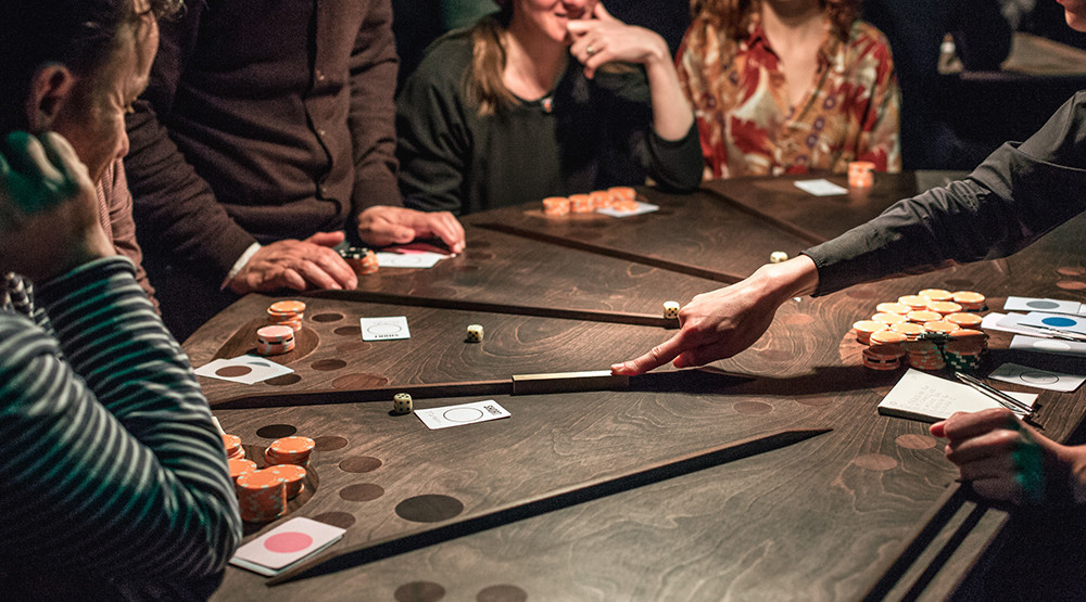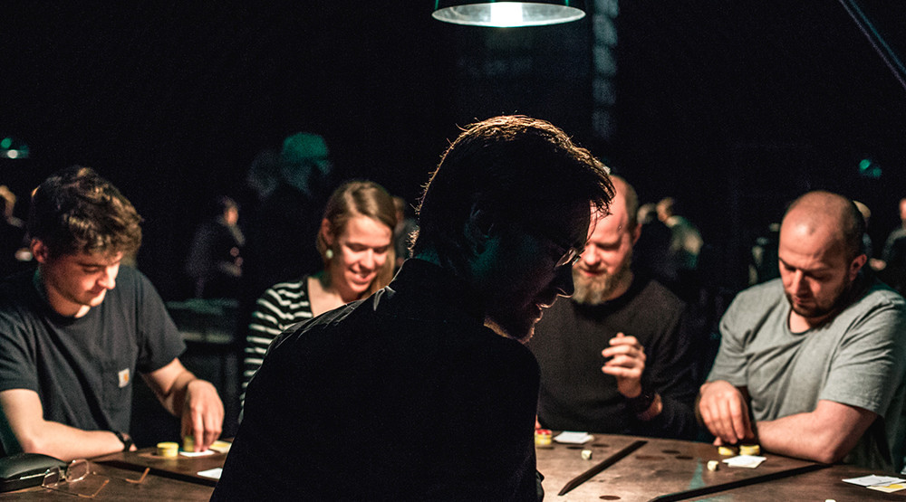 Декорацией служит внушительное затемненное пространство – зал нелегального (по крайней мере, в России, где с коллективными азартными играми покончили ещё в относительно тихие нулевые) казино. Участники распределяются по 10 полукруглым столам, напоминающим рулетку (распорядители мягко, но непреклонно разлучают вас с друзьями-знакомыми). Люди в черном – актеры, играющие крупье, – начинают шоу с таинственного сбора в центре зала: мистицизм присущ всем проектам Ontroerend Goed, даже этому, где речь, вроде бы, о сугубо рациональных материях (и это, конечно, беспроигрышный способ сделать тебя соучастником – и напомнить о магической ритуальной природе театрального представления). После чего запускается игра.