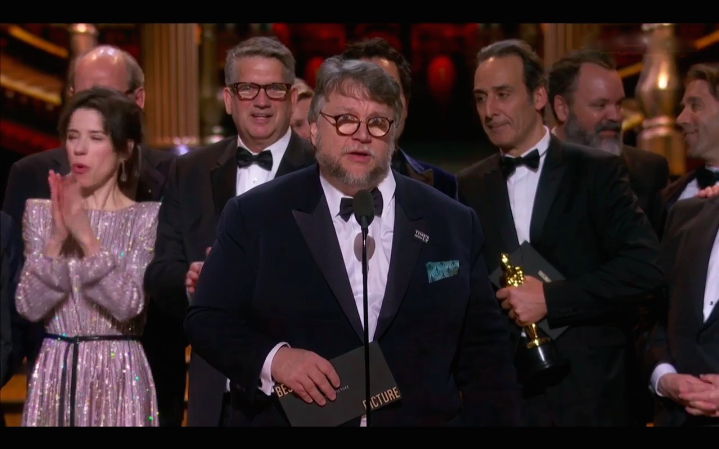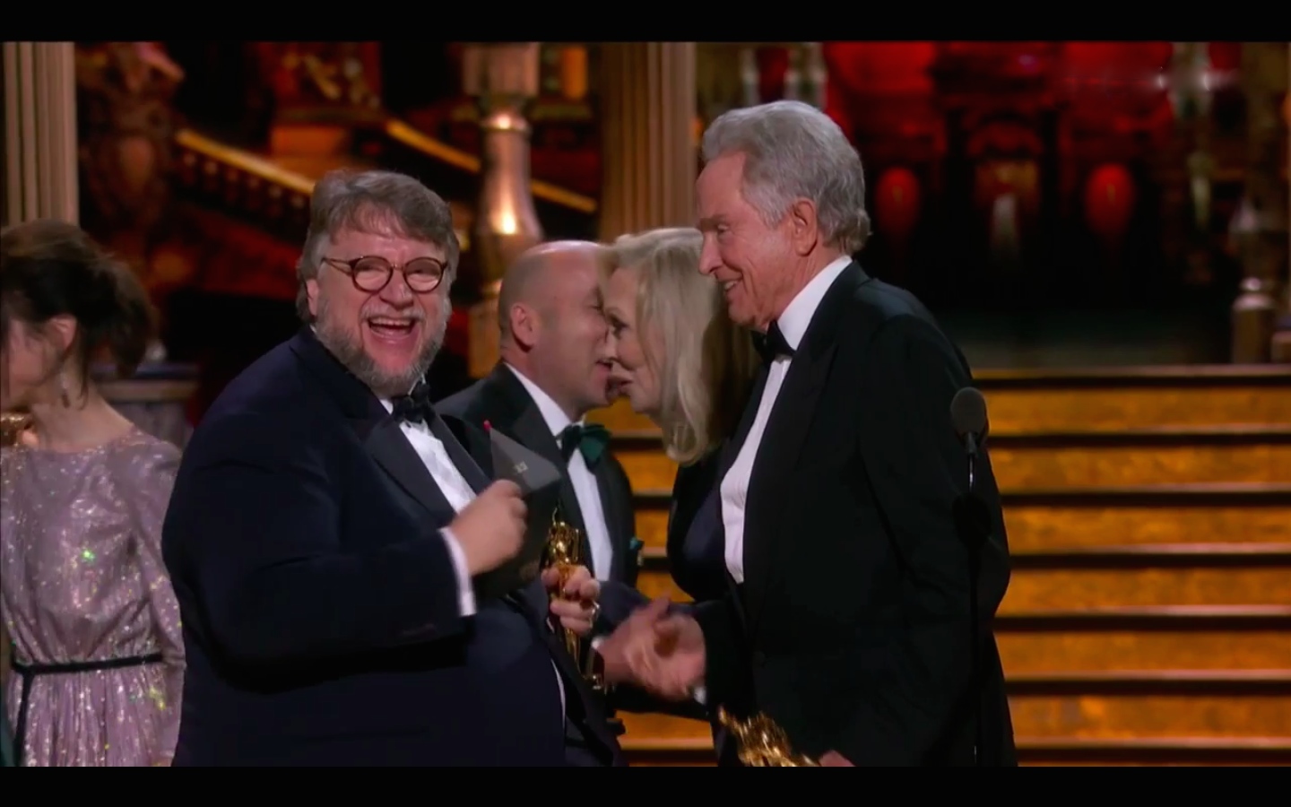 Эмма Стоун воздала должное видению режиссера и объявила победителя в соответствующей номинации: лучший режиссер – Гильермо дель Торо, «Форма воды». В первую очередь дель Торо обратился к соотечественникам-мексиканцам: «Я эмигрант, как Алехандро, Салма, Гаэль, много лет живу в стране, которую мы сделали своей. Лучшее, что есть в нашей индустрии, – возможность стирать границы». Всё верно, не придерёшься. Проигравшие дель Торо коллеги – Кристофер Нолан («Дюнкерк»), Грета Гервиг («Леди Бёрд»), Пол Томас Андерсон («Призрачная нить») и Джордан Пил («Прочь») выглядели довольными и солидарными с победителем.