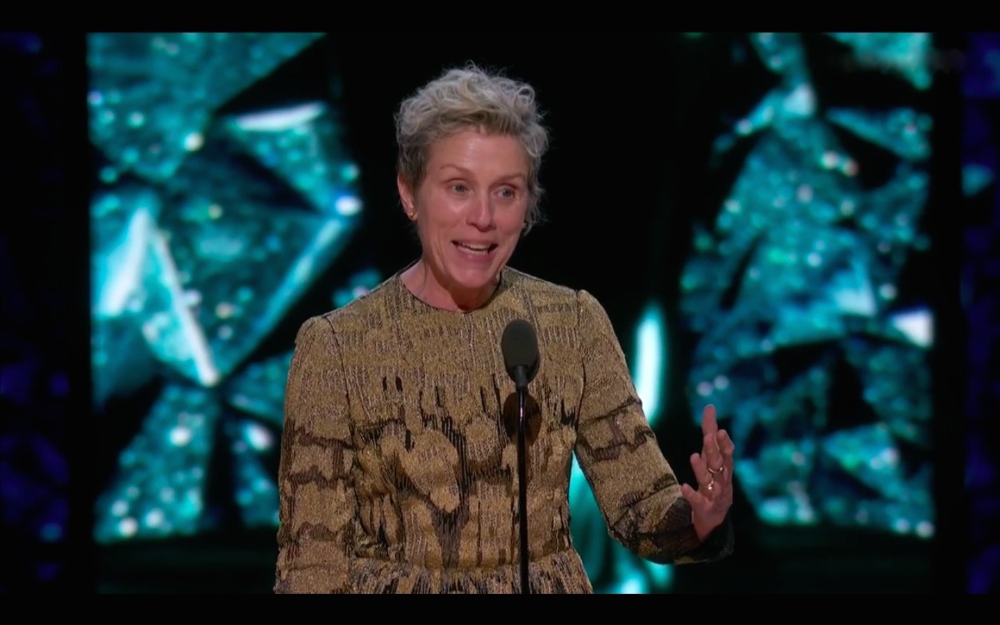 Дженнифер Лоуренс и Джоди Фостер на костылях («Что с тобой случилось? – Стрип! – Она и мне когда-то подставила подножку») вручили приз лучшей актрисе. Фрэнсис МакДорманд, звезда «Трёх биллбордов на границе Эббинга, Миссури» выиграла «Оскар» в соперничестве с Марго Робби («Тоня против всех»), Мерил Стрип («Секретное досье»), Сиоршей Ронан («Леди Бёрд») и Салли Хоукинс («Форма воды»). В своей эмоциональной речи МакДорманд поблагодарила не только такого же, как она, «дебошира и анархиста» Мартина МакДонаха, но и братьев Коэн, подаривших ей предыдущую оскароносную роль – в «Фарго».