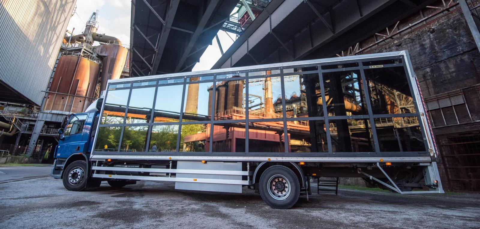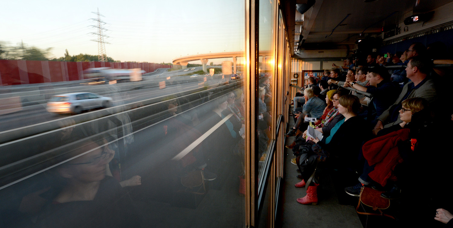 Снаружи левая сторона кузова зеркальна – изнутри она окажется проницаемой (в одностороннем порядке) стеклянной стеной. Но когда мы занимаем место в одном из трех рядов внутри («зал» рассчитан на 50 зрителей), стена закрыта экраном: на него будет проецироваться то, что происходит в кабине водителей, а также видео и титры с информацией – самая традиционная составляющая спектакля, небольшая, но важная его часть.