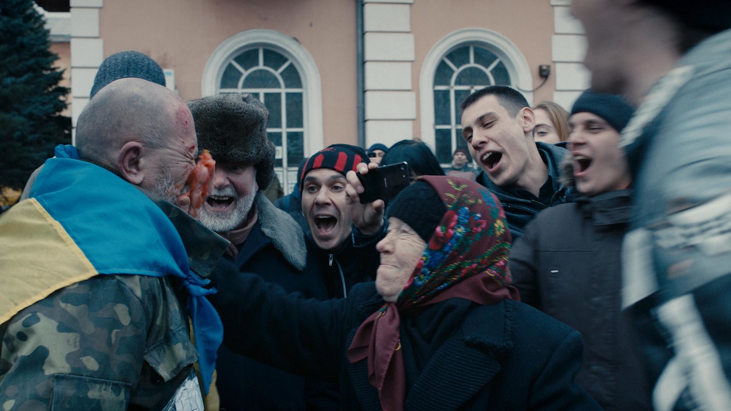 Во-вторых, фильм набирает обороты и силу от кадра к кадру – как персонажи кульминационной сцены, в которой на потеху народу Донбасса к столбу привязывают старика в камуфляже, вот, дескать, любуйтесь на «добровольца карательного батальона». Народ в лице выпрыгнувших из машины гопарей начинает с селфи, толпа вокруг арестанта растёт и постепенно самовозгоняется до кровавых побоев, а вот уже и до пули в голову один щелчок пальца.