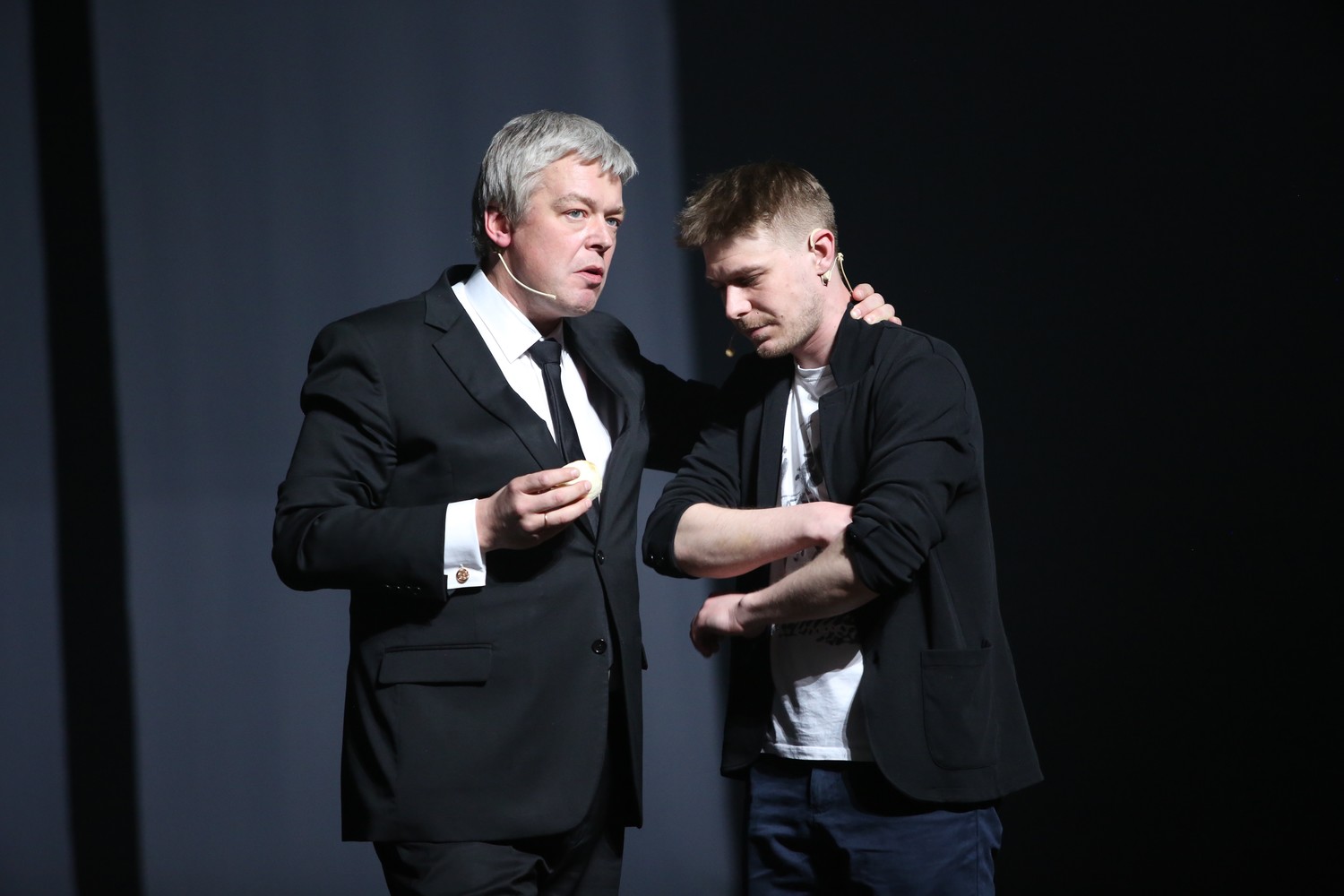 Его тон задают уже церемонии открытия: не общепринятые официозы с говорильней, разбавленной музыкальными номерами (кстати, даже омский губернатор Виктор Назаров отличается от большинства официальных лиц способностью говорить без канцеляризмов и от сердца), но полноценные маленькие спектакли, достойные респектабельной Омской драмы. В 2017-м Алексей Агранович поставил – не без сердитой иронии – спектакль о театре, церемонию о подготовке церемонии, выведя на сцену юнца-режиссера (Никита Ефремов) и зрелого продюсера (герой Александра Стриженова будто с экрана сошел – из «Пьяной фирмы», абсолютного хита прошлогоднего «Движения»).