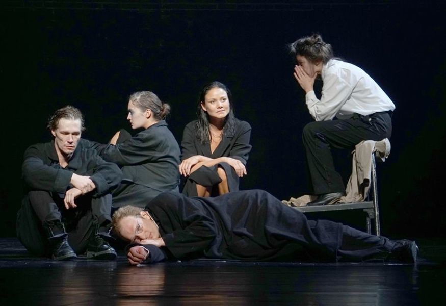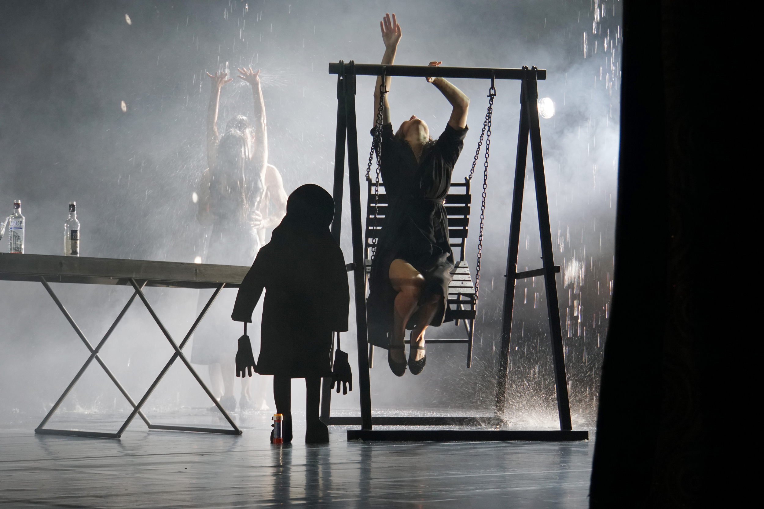 Про пародийный рефрен – Янковского в «Ностальгии» – уже сказал; фантазии, как описать Париж после всех тысяч уже написанных слов, питаются легендой о Крысолове; эпиграф из учебника русской грамматики, использованный в набоковском «Даре», становится священным текстом со скрижали; сквозь обои поверх газет призраком пробивается надпись «Реквием». В сценографии Николая Симонова никакого натурализма, слово это мелом пишет на чёрной стене Лаура Пицхелаури, и это всё очень красивые абстракции, и когда в финале первого акта стены, огораживающие условное пространство квартиры, взмывают вверх, а из водосточных труб льётся вода, эти потоки говорят и про Петербург, и про интеллигенцию, и про нераздеденную (а как же иначе) любовь лучше потоков словесных. И на то, как под стробоскопические вспышки танцуют гибкие красавицы с длинными волосами смотреть можно бесконечно. Мог же Бутусов обойтись с текстом Волошиной как с Шекспиром в «Макбет. Кино» – то есть, свести почти на нет. Однако не обошелся.