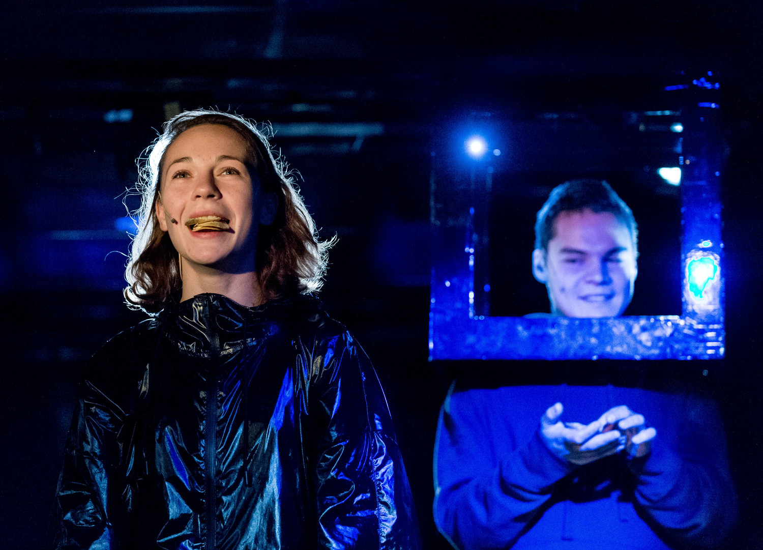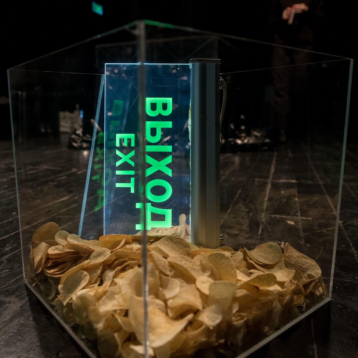 В «Смерти и чипсах» есть анимационные фильмики, прослаивающие действие, связывающие новеллы между собой (видеохудожники – Мария Алигожина и Алексей Ермолаев) – и это не просто дежурное использование видеопроекции, не оживляж, но часть художественного мира, осознанно инфантильная виньетка, контрапункт к зловещему содержанию. Мультики здесь – сродни чипсам, разбросанным по стеклянным аквариумам с электронными светящимися табличками «Выход» (это же как раз про поиск выхода – в небытие или всё таки в жизнь); они также вписаны в сценографию Дмитрия Разумова, как этот хрустящий пустяк, фаст фуд для фаст лайф. Кстати, в плане театральной зрелищности этот незатейливый корм работает отлично: он бросается в глаза своей вопиющей антитеатральностью, его хруст может быть и забавным, и жутким – по обстоятельствам.