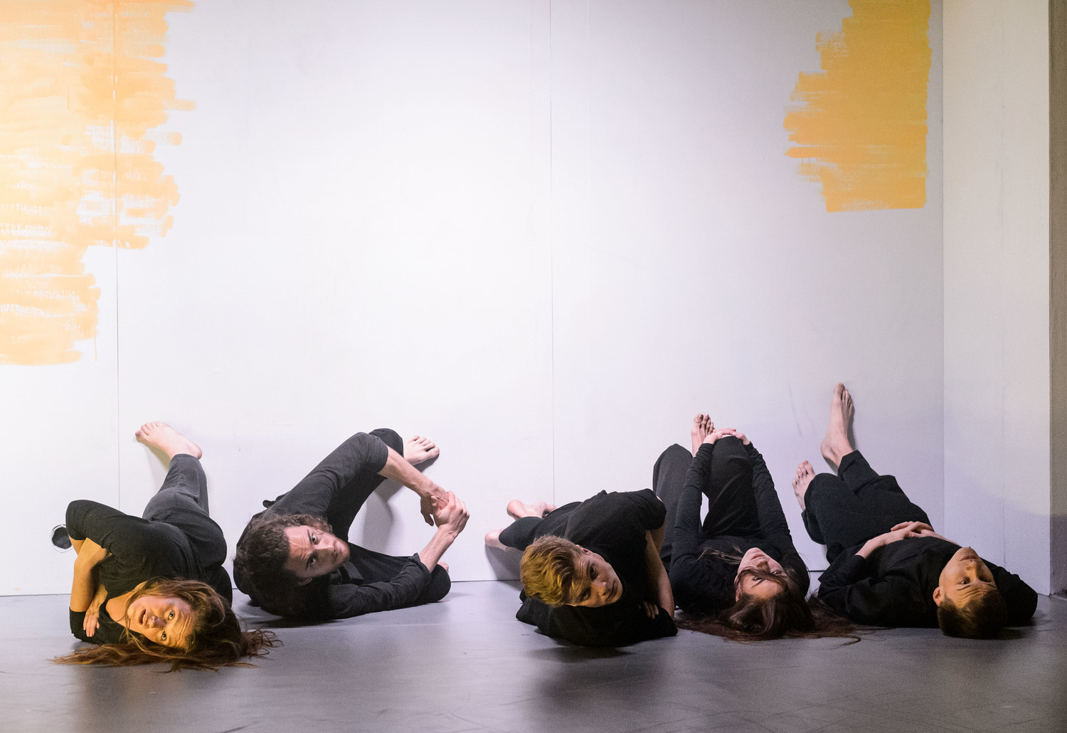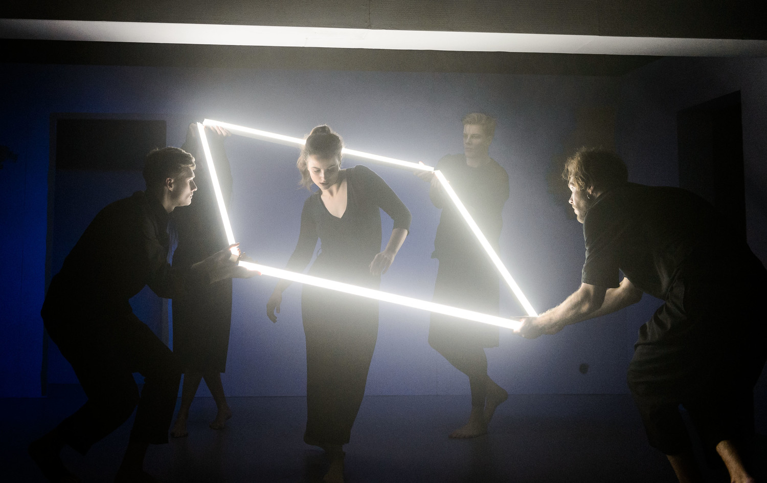 А хореографию двух урбанистических ноктюрнов – «Несколько разговоров о» и «Дождь в Нойкёльне» – дополняет холодный неоновый свет. В «Разговорах» (художник – Ольга Пашаева) неоновые трубки танцуют вместе с артистами, складываются в мозаичные картины, рифмуются с «внутренним светом» и «подсвечивают» хрупкость героев; это убедительнее многих психологических «петелек-крючочков».