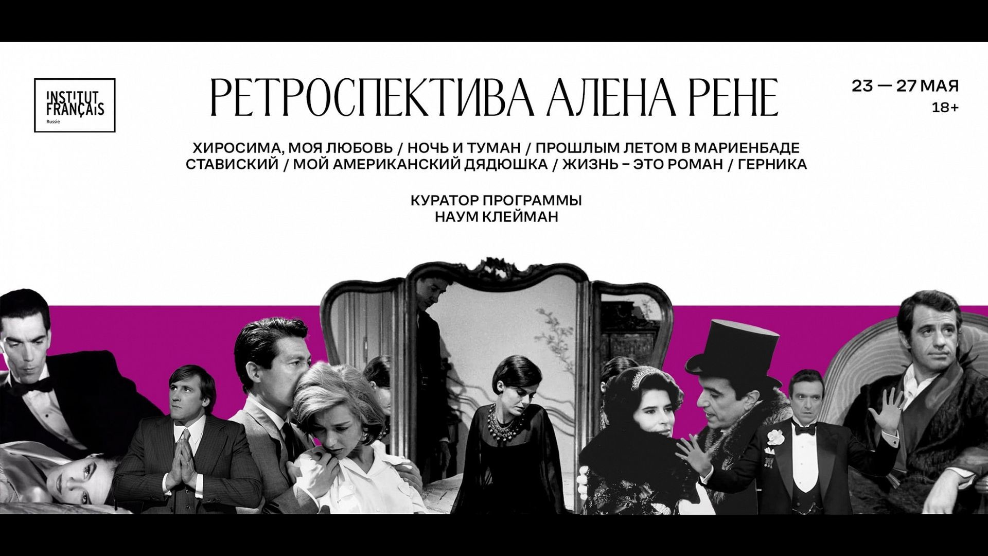 Французским институтом в России представят ретроспективу фильмов Алена Рене. Куратором программы выступил киновед Наум Клейман. Все показы программы будут сопровождаться представлениями киноведов.