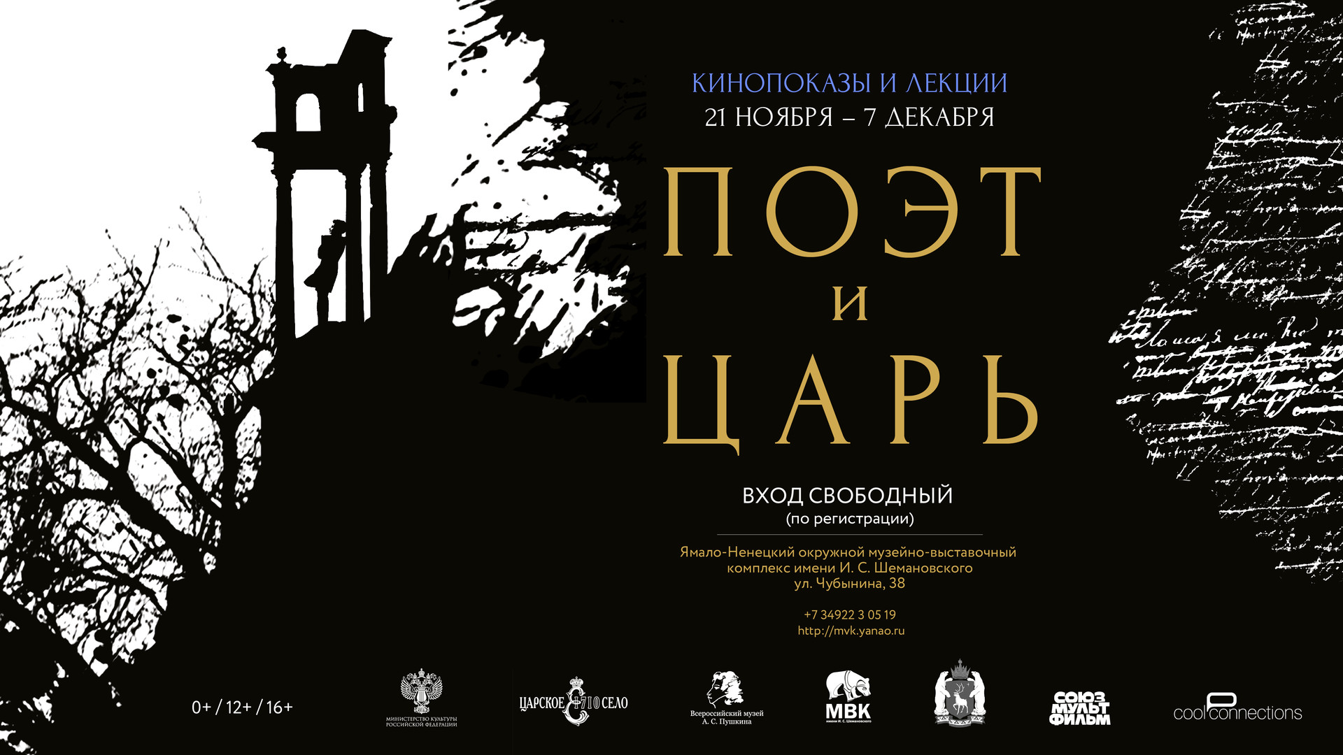 Программа кинопоказов, посвящённая жизни и произведениям Александра Сергеевича Пушкина, – часть масштабного совместного проекта Государственного музея-заповедника «Царское Село» и Всероссийского музея А. С. Пушкина при поддержке Минкультуры РФ. Передвижной выставочный проект «Поэт и царь» открылся в Царском Селе в год 225-летия со дня рождения Александра Пушкина, в 2025 году он начал свое путешествие по России с Новосибирска, затем продолжится в Тюмени и Салехарде. Экспозицию дополняет лекционная программа и серия специальных показов отечественных фильмов разных эпох.
